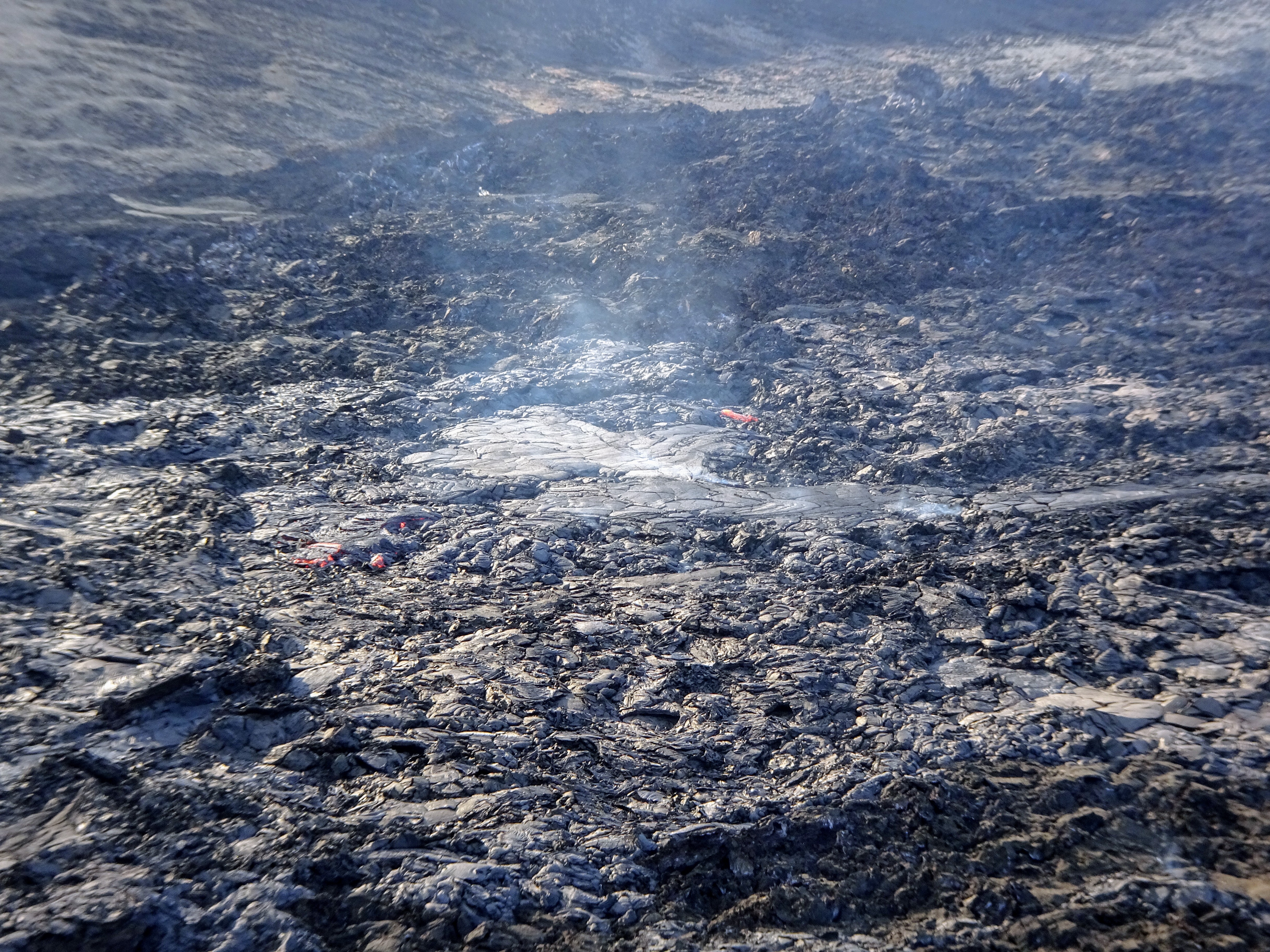 Passing the fresh lava field on the way back to the car. The lava was getting closer and closer to the path and a low point between the hills with lava on either side.